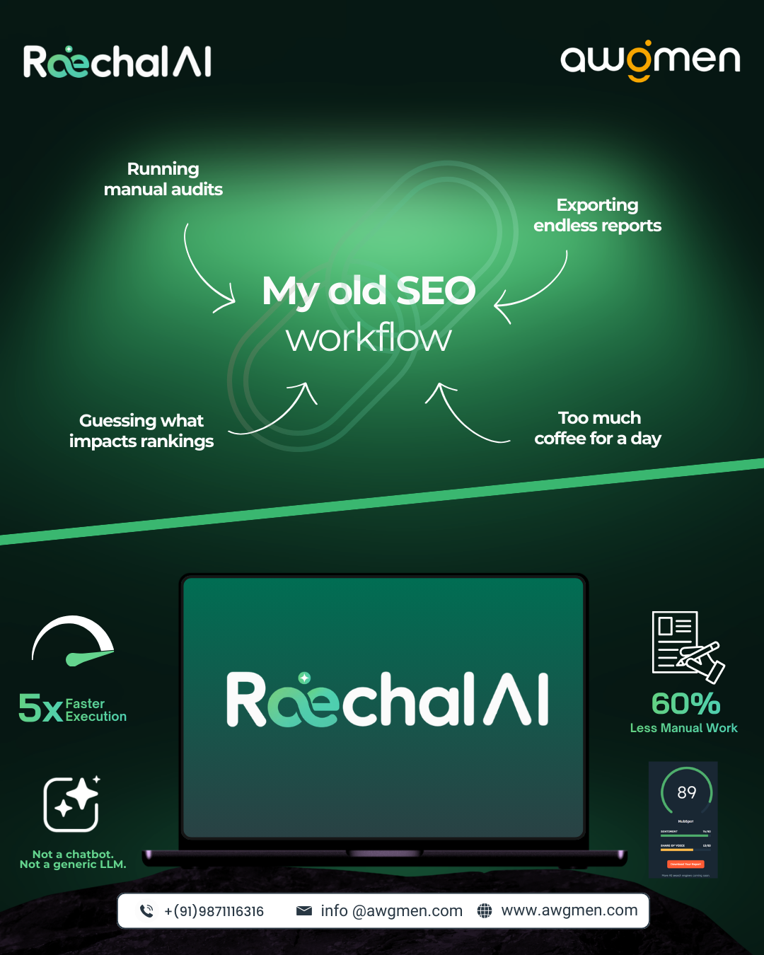 Raechal brings together AI-powered SEO, performance marketing, world-class content, and intelligent analytics under one roof, so you never have to coordinate five agencies again.